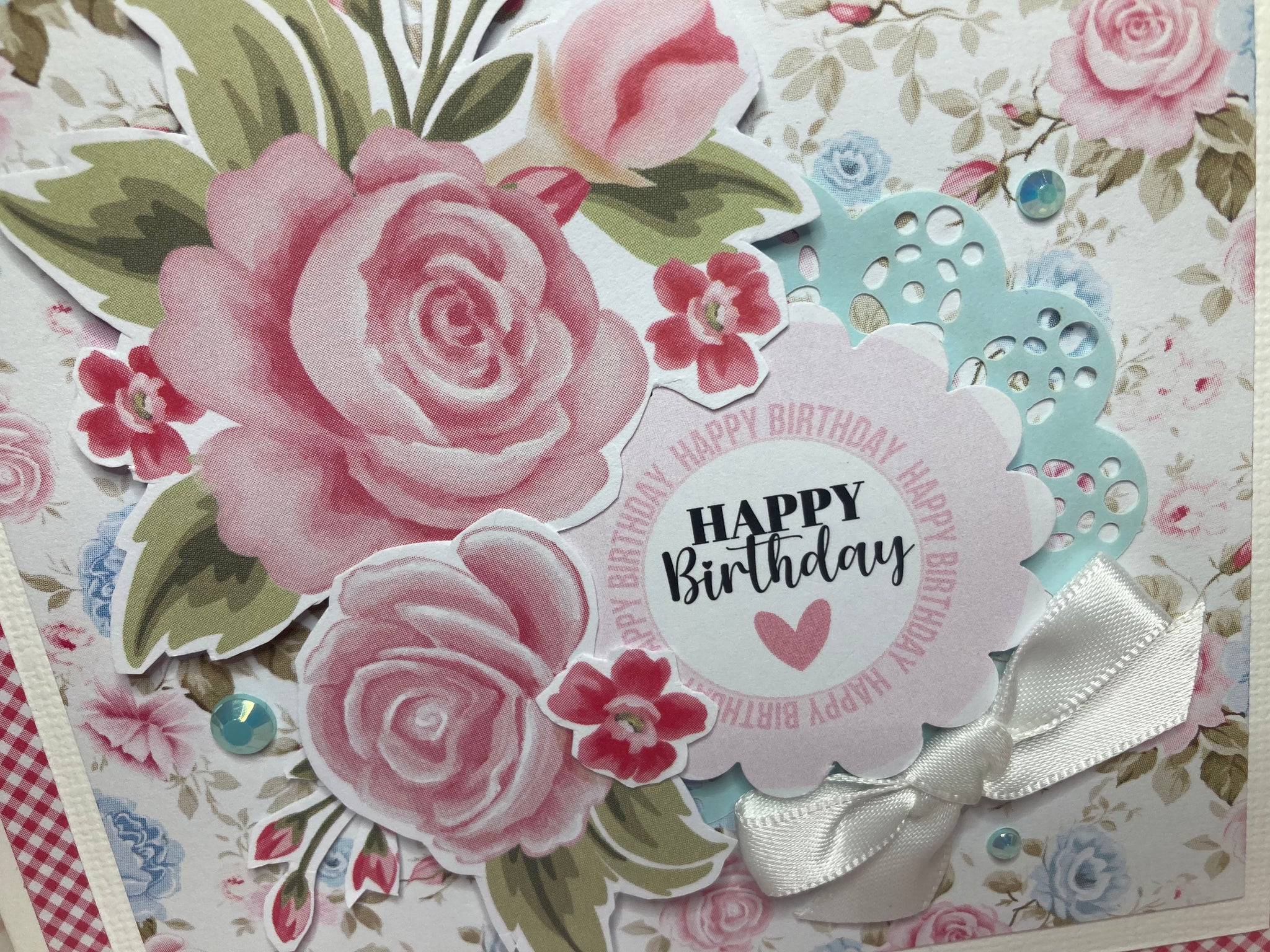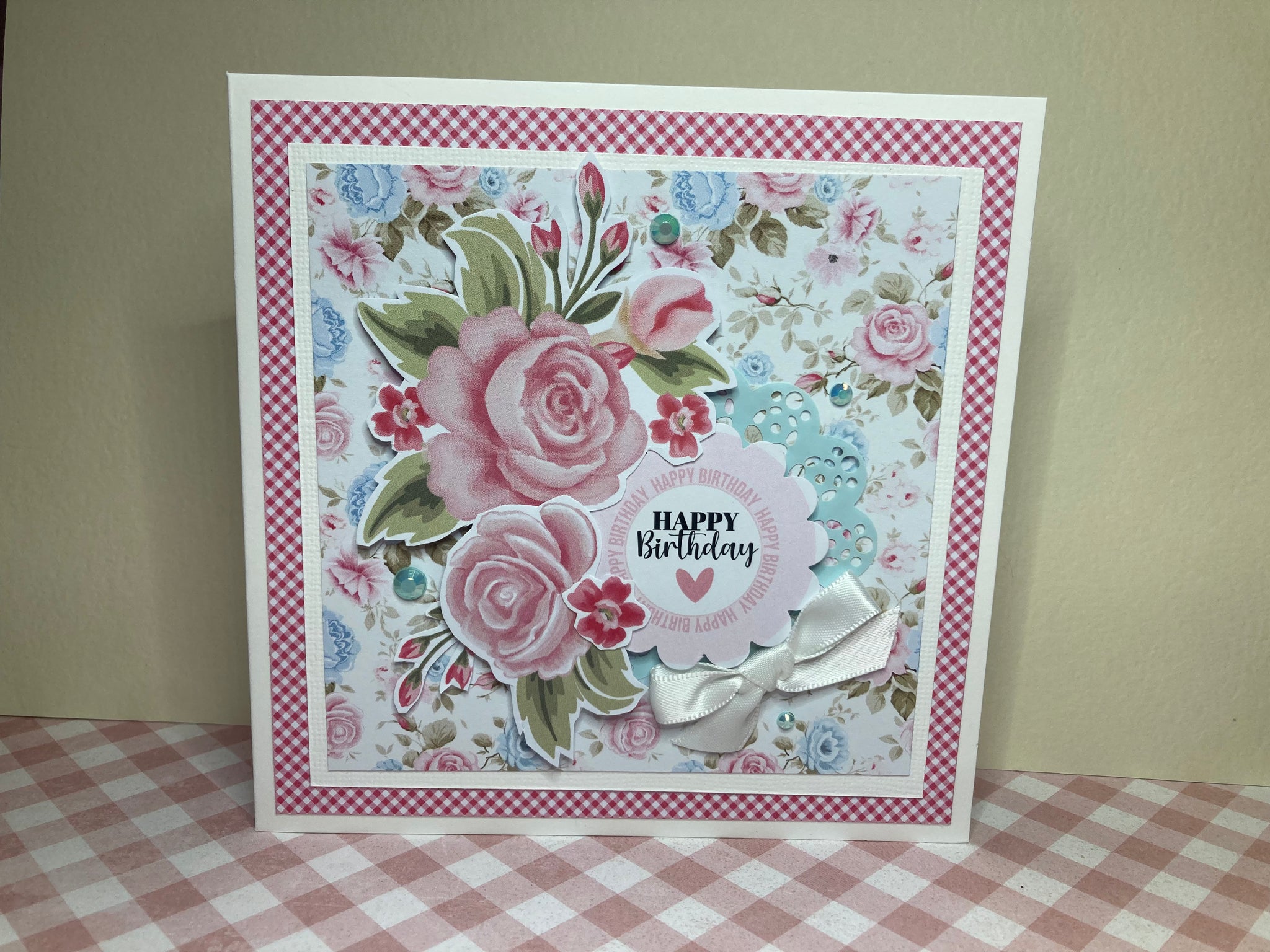A Beautiful Handmade Card using Uniquely Creative Patchwork Roses quality papers Ribbons and Embellishments.
